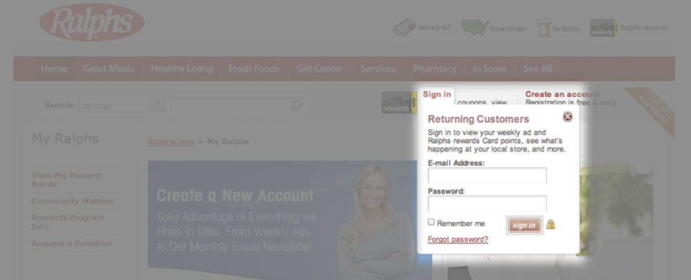 Click “Sign in” near the top right. You will be prompted to enter you email address and password. If you have never logged into MyRalphs, you will need to first create an account. |