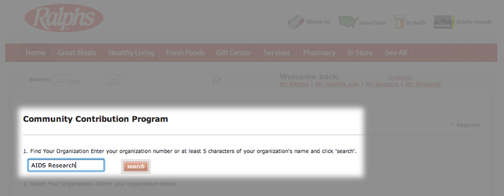 Every time you use your Ralphs card, you could help support AIDS Research Alliance. Visit Ralphs.com and follow these directions to enable your Ralph’s Rewards card:
