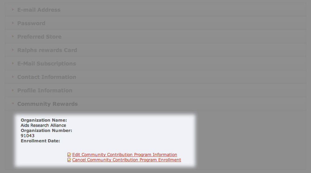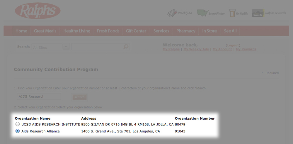 Finally, confirm that you have added AIDS Research Alliance to your Community Rewards section of MyRalphs. |